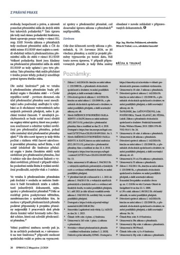Martina Pelikánová, a lawyer at our law firm Bříza & Trubač, highlights an important amendment to the Act on Transformations of Commercial Companies and Cooperatives (No. 162/2024 Coll.), which came into effect on July 19, 2024. This amendment, implementing the European Directive, the so-called Mobility Directive (EU 2019/2121), introduces a number of innovations in the regulation of both domestic and cross-border transformations.